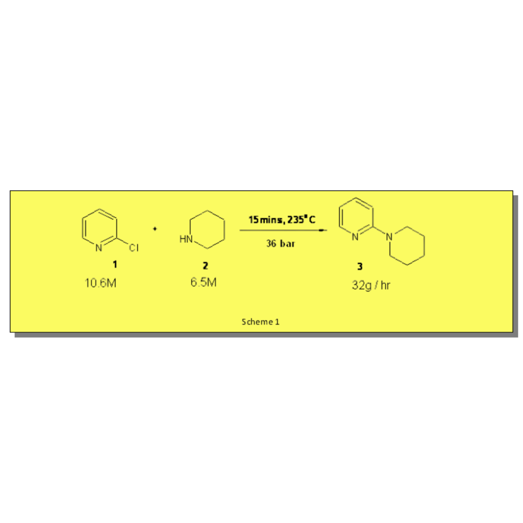 This application note illustrates the use of the Vapourtec R-Series system to run reactions under solvent free (neat) conditions. It expands the work previously highlighted in Application note 29 in which a novel stratagem for throughput of material was demonstrated using a bench top system. By harnessing the higher temperatures and pressures available on the Vapourtec R-Series and again running the reaction solvent free it is possible to perform direct uncatalyzed amination of 2-chloropyridine on potentially larger scales than previously thoughti.