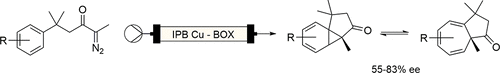 Enantioselective intramolecular Buchner reactions of α-diazoketones can be effected using heterogeneous copper–bis(oxazoline) catalysts in batch or using continuous flow processing in up to 83% ee. The catalyst can be reused up to 7 times without loss of activity. For α-diazoketones 3 and 4, the enantioselection achieved in flow with the immobilized catalyst was comparable with the standard homogeneous catalyzed process.