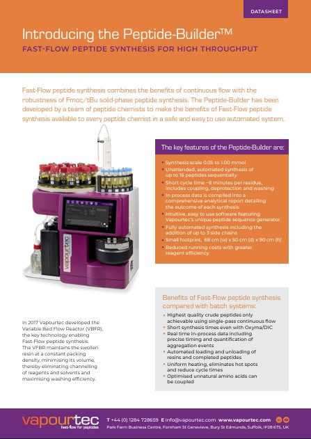 The Peptide-Builder is designed for peptide chemists who want to make high quality peptides quickly and easily at laboratory scale. View and download the datasheet here.