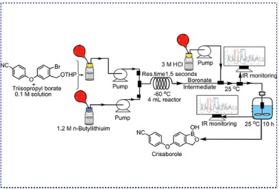 Crisaborole, a distinctive boron-containing phosphodiesterase inhibitor, is used for the treatment of atopic dermatitis and eczema in adults and children. The development process for crisaborole involves organolithiation through a Br/Li exchange at −78 °C in batch mode. A continuous flow chemistry process was successfully developed for the synthesis of the key boronate intermediate of crisaborole, enabling efficient mixing, impurity control, and improved yield. The flow approach reduced the residence time dramatically from 1800 s in batch mode to just 1.5 s, and while elevating the temperature from −78 to −60 °C, it maintained precise control over impurity formation and achieved a significant improvement in overall yield. The boronate intermediate was subsequently subjected to one-pot THP deprotection and cyclization, resulting in the successful production of crisaborole in kilogram quantities. This approach allowed for effective control over product formation, optimized conditions for scalability, and careful management of the three impurities. The application of a quality by design (QbD) approach in the flow synthesis of crisaborole enabled systematic control and minimization of three critical impurities by establishing a thorough understanding of process parameters and their impact on product quality while also ensuring optimized conditions for scalability and effective control over product formation.