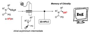 Amino acid derivatives undergo non-Kolbe electrolysis to afford enantiomerically enriched α-alkoxyamino derivatives through intermediate chiral carbenium ions. The products contain N,O-acetals which are important structural motifs found in bioactive natural products. The reactio...