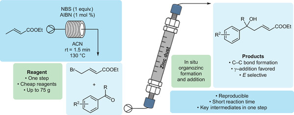 The Reformatsky reaction is a well-established method for the synthesis of β-hydroxyesters, a structural motif commonly found in natural products. While continuous-flow adaptations of the traditional Reformatsky reaction, which offer improved safety and efficiency, have been reported, related transformations using γ-bromocrotonate esters have not yet been explored in flow chemistry. Under batch conditions, the corresponding organozinc reagent can yield both γ- and α-adducts, depending on the metal employed and the specific reaction parameters. In this study, we report the first Reformatsky-type reaction in continuous flow using ethyl γ-bromocrotonate, with conditions optimized to favor γ-selectivity and the synthesis of homoallylic alcohols. Zinc dust was utilized as the reagent, and the reaction scope was demonstrated with a variety of carbonyl compounds, including in a four-step synthesis of piperine. Furthermore, the synthesis of ethyl γ-bromocrotonate was efficiently accomplished under continuous-flow conditions on a multigram scale via a Wohl–Ziegler bromination.