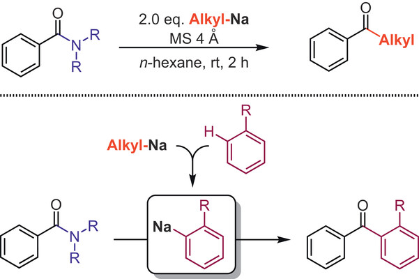 The transformation of alkyl and aryl sodium reagents with N-alkyl amides is described. The reaction sequence is initiated by an alkyl sodium reagent, which is generated in a flow reactor. The alkyl sodium reagent is either directly reacted with N-alkyl amides or used for the reaction with alkyl-substituted or alkoxy-substituted arenes to generate secondary sodium reagents which were then reacted with the amides to afford the desired ketones in moderate to good yields.