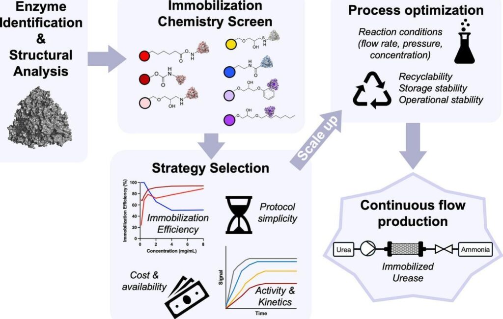 Enzymes have shown promise in various industries due to their functional specicity, catalytic efciency, and environmental sustainability. These biological catalysts can be a pivotal component of manufacturing pipelines like continuous ow chemistry. For this, there exists a need to robustly immobilize enzymes on solid supports and assess the effects of the solid supports on catalytic performance and stability. Here, we use an industrially relevant model enzyme, C. ensiformis (Jack bean) urease, to demonstrate immobilization and assess performance in the context of continuous ow manufacturing. Various immobilization strategies were screened focusing on immobilization efciency, protocol simplicity, and urease biocatalyst kinetics. Based on this, CDI-agarose and NHS-agarose resins were identied as the best-performing immobilization strategies for urease. CDI-agarose- urease and NHS-agarose-urease were then scaled up and applied to a large-scale continuous ow reactor to evaluate product yields, operational stability, and long-term stability. These experiments identied differences in stability and performance depending on the immobilization method tested. This highlights the importance of screening immobilization methods and subsequent enzyme performance for each candidate biocatalyst used in manufacturing to promote optimal performance and stability. As such, this work provides a framework for evaluating enzyme biocatalyst immobilization approaches to improve performance and enable transition into industrial processes