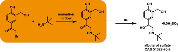 Albuterol sulfate is a short-acting bronchodilator used extensively in the treatment of asthmatic patients. However, shortages in the supply of nebulized albuterol sulfate solution (the drug product) have impacted patient access. The traditional approach to this important drug uses a SN2 amination reaction for production of a key intermediate, but this reaction is usually performed using batch conditions where formation of side-products, including dimers, is common. These issues lead to reduced efficiency and an increase in the requirement for extensive purification and processing.