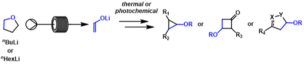 Lithiation of THF offers a convenient method for formation of the Li-equivalent of acetaldehyde. However, this reaction generates two equivalents of the flammable gases ethylene and butane, and the process is highly exothermic; upon scale-up there are significant safety concerns. In this regard, flow chemistry offers a viable solution due to the improved control over heat and mass transfer under a miniaturised set-up.