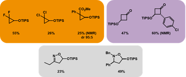 The silyl enol ether generated was used in situ within a range of cycloaddition reactions to afford strained ring systems, which are of increasing interest to the medicinal chemistry community. [2, 3, 4] Overall, [2 + 1], [2 + 2] and [2 + 3] cycloadditions were investigated to produce cyclopropanes, cyclobutanones (though photochemical and thermal pathways), isooxazolines and isoxazolidines, Figure 2. Methyl-substituted THF rings were also tolerated.