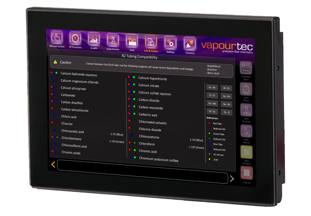 The E-Series system features Vapourtec’s unique high-pressure chemically resistant peristaltic pumps. The tube compatibility tool features Vapourtec’s unique library of reagents and solvents to ensure the correct pump tube is selected for your application. The compatibility guide is quick and easy to use.